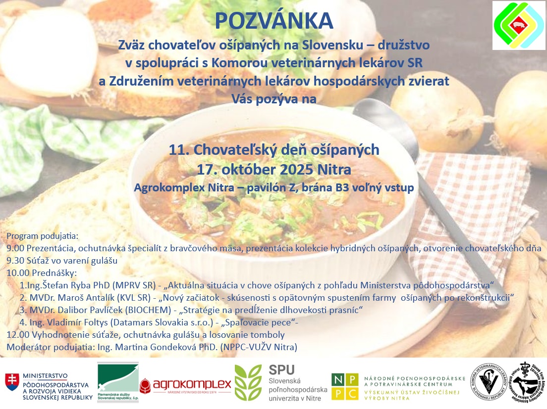 Pozvánka – 11. chovateľský deň ošípaných Od SprávcaPublikované 8. októbra 2025 Navigácia v článku Pripomienka Výzvy 1/SP/2025 – 76.1 (PPA)AKTUALIZÁCIA 2.12.2025 – Aktualizované Mimoriadne núdzové opatrenie SLAK